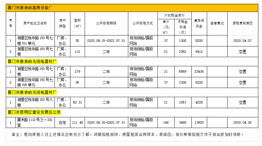 思明區屬托管企業(yè)擬出租房產(chǎn)招租情況公告