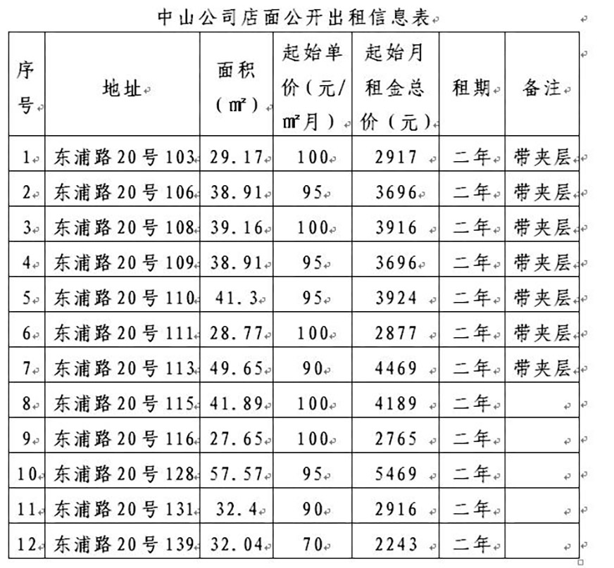 備注:意向承租人參加投標前應對以上店面招租情況有充分了解并可以實(shí)地踏勘。詳細招租規則、房屋租賃合同樣本、承諾函、報價(jià)單等招租文件可聯(lián)系招租人領(lǐng)取。