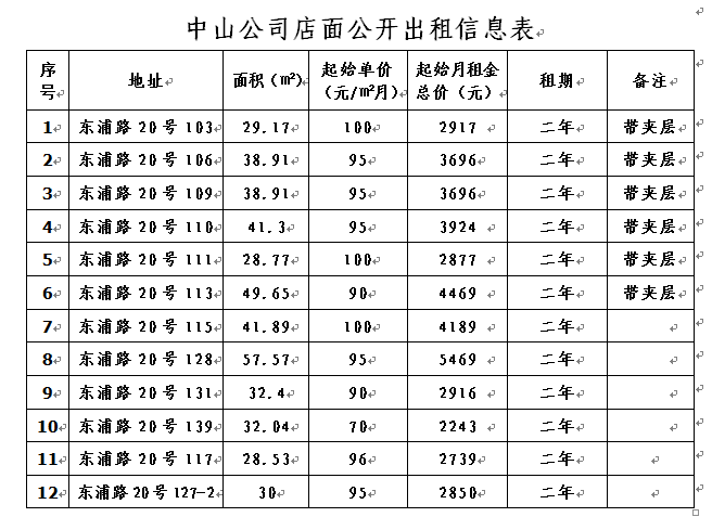 備注:意向承租人參加投標前應對以上店面招租情況有充分了解并可以實(shí)地踏勘。詳細招租規則、房屋租賃合同樣本、承諾函、報價(jià)單等招租文件可聯(lián)系招租人領(lǐng)取。