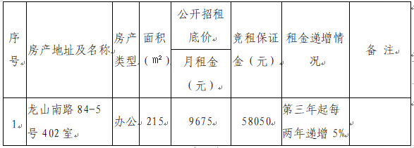 根據國有企業(yè)資產(chǎn)出租管理相關(guān)制度,我司決定對位于龍山南路84-5號402室房產(chǎn)對符合入駐條件的意向承租人進(jìn)行公開(kāi)競價(jià)招租,具體信息如下: