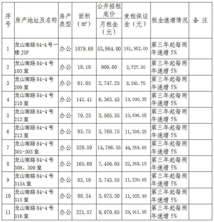 根據國有企業(yè)資產(chǎn)出租管理相關(guān)制度,我司決定對位于思明區龍山南路84-4號樓部分面積房產(chǎn)對符合入駐條件的意向承租人進(jìn)行公開(kāi)競價(jià)招租,具體信息如下: