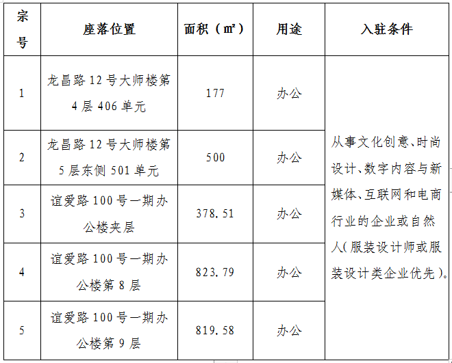 根據國有企業(yè)資產(chǎn)出租管理相關(guān)制度,我司決定對位于龍昌路12號、誼愛(ài)路100號嘉蓮商務(wù)中心下列5宗房產(chǎn)對符合入駐條件的意向承租人進(jìn)行公開(kāi)競價(jià)招租,具體信息如下: