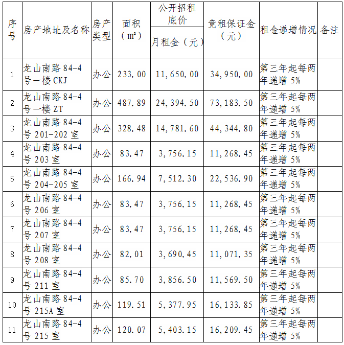 根據國有企業(yè)資產(chǎn)出租管理相關(guān)制度,我司決定對位于思明區龍山南路84-4號樓部分面積房產(chǎn)對符合入駐條件的意向承租人進(jìn)行公開(kāi)競價(jià)招租,具體信息如下: