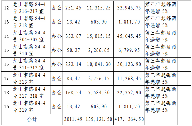 一、出租標的:思明區龍山南路84-4號樓部分面積房產(chǎn)3011.49平方米,優(yōu)先考慮整體承租的承租戶(hù),明細如下: